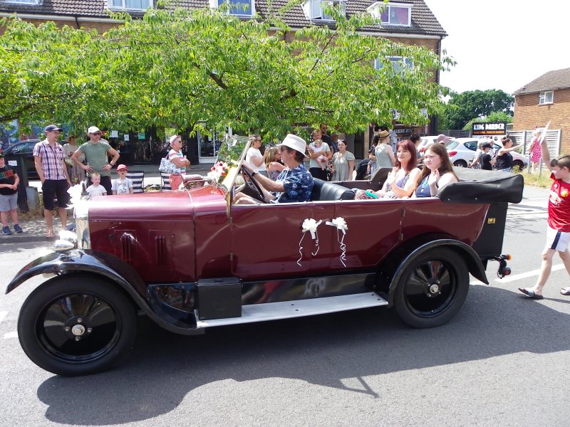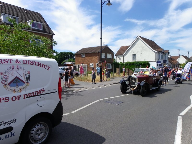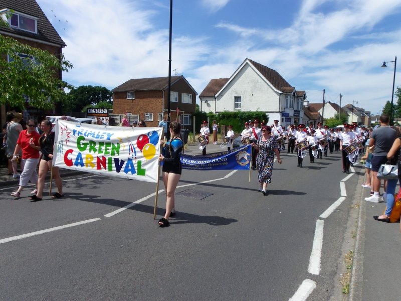 The procession was headed up two people carrying the Frimley Green Carnival Banner, followed by the Sandhurst and District Corps of Drums Marching Band and then a vintage car carrying the