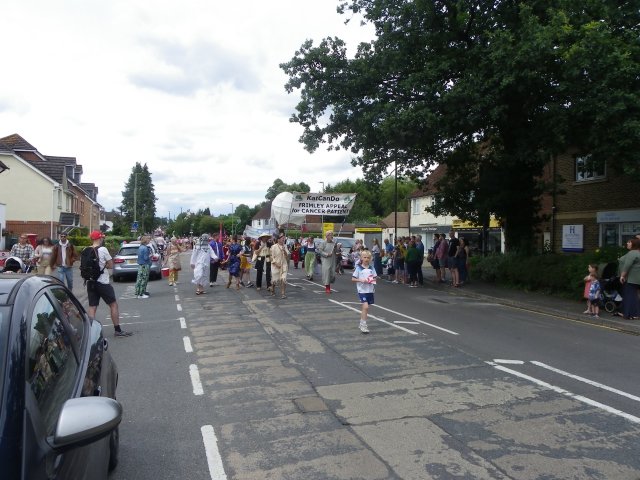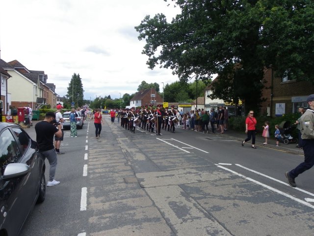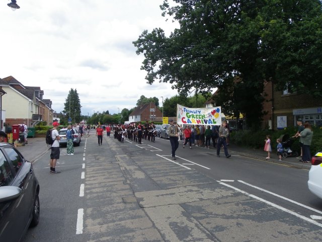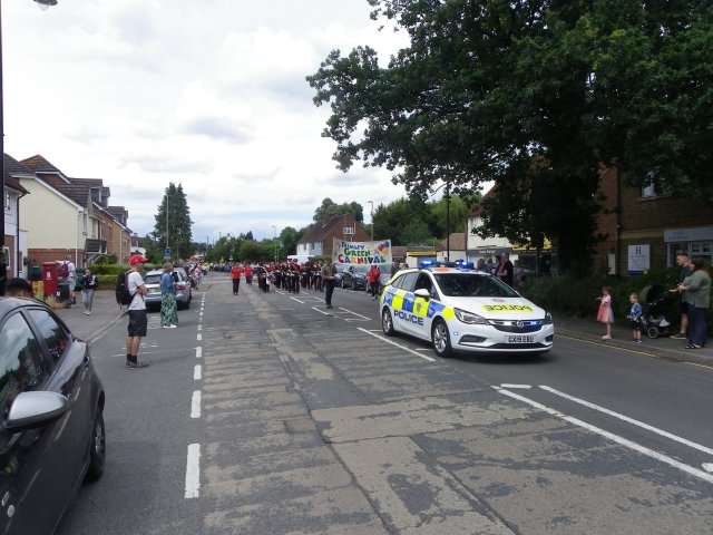 which this year was mostly walking groups. The procession was headed up by a police car followed by two people carrying the Frimley Green Carnival Banner, the Sandhurst and District Corps of Drums Marching Band,